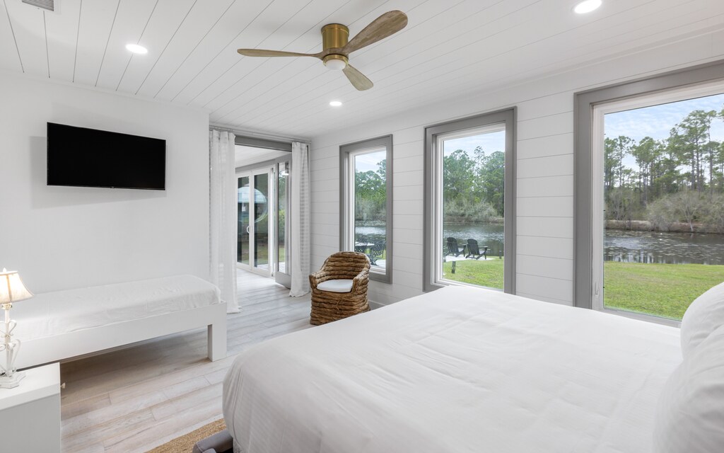 The primary bedroom, king, embodies romance and serenity, providing couples with a private retreat to unwind and reconnect. The enchanting space includes a luxurious en-suite bath, with separate shower and tub. A sliding glass door welcomes guests outside to the peaceful ambiance of the pond.