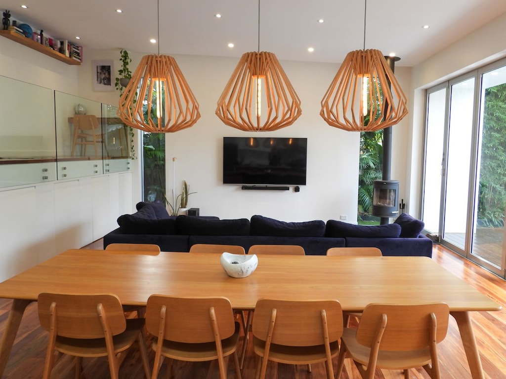 Beyond the confines of the home, a sparkling pool provides a refreshing oasis. Adjacent, a sprawling outdoor dining area with BBQ, perfect for al fresco gatherings of up to twelve—an invitation to share laughter. After a swim in the pool relax and enjoy the benefits of the 2 person Kylin infrared sauna - perfect for a moment to relax and unwind.