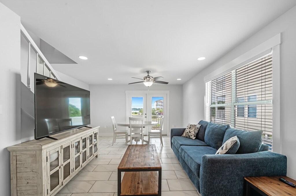 As you step inside, you’re greeted by a spacious and inviting living space adorned with coastal-inspired decor. Sink into plush sofa as you unwind after a day of beachcombing or lounging by the pool. Large windows allow natural light to fill the room, offering glimpses of the tranquil lagoon just beyond.
