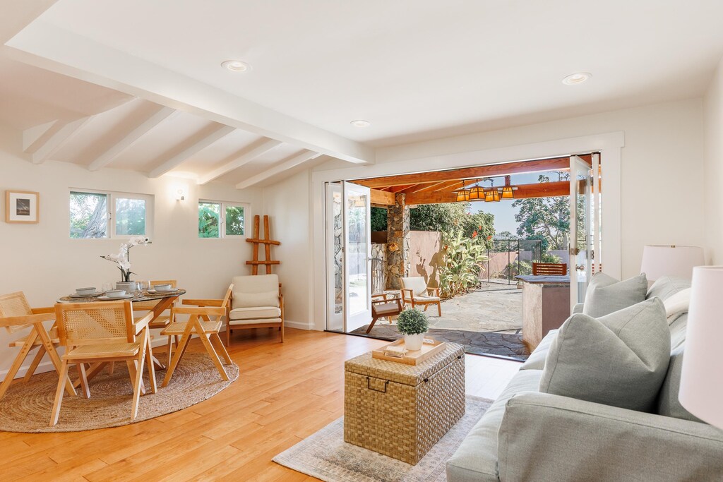 Venture outside to the backyard oasis, where you’ll find seamless indoor/outdoor living on the stone patio, complete with a fireplace and bar. Beyond your patio, take a dip in your private pool and spa surrounded by lush greenery and swaying palm trees. Whether you’re basking in the California sun on a lounge chair or unwinding in the bubbling spa under the stars, this serene outdoor space sets the stage for unforgettable moments. The well-maintained garden and patio area offer an ideal setting for al fresco dining or sipping your morning coffee in the fresh sea breeze.