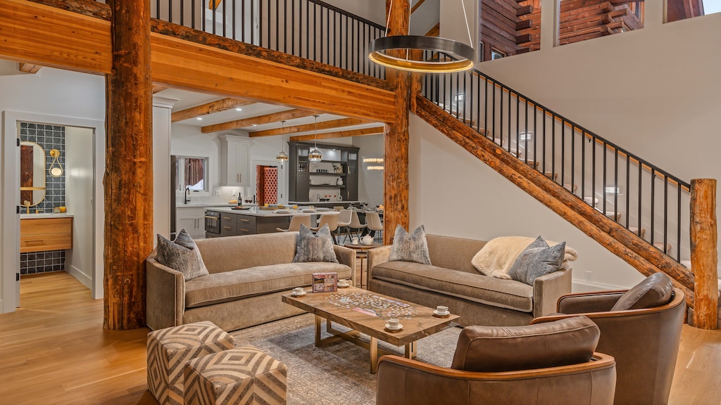 Perched high above the valley, Watchtower Chalet offers breathtaking views. This newly remodeled haven stuns with its warm, inviting ambiance. Striking brass hardware, light wood features, and earthy, soft grays, browns and cream colors throughout the residence exude warmth.