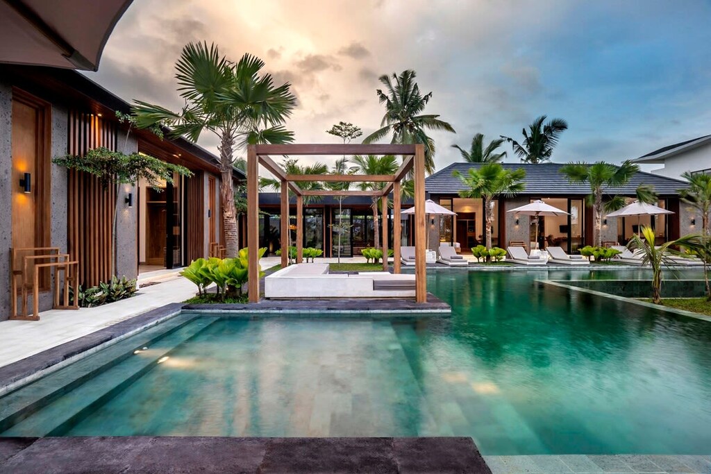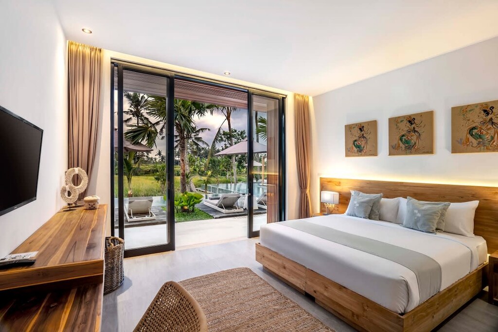 All 5 bedrooms are in front of the spacious pool and equipped with A/C, TV, safety box and en-suite bathroom. Floor-to-ceiling windows offer a breathtaking view over the pool area and rice fields behind, while you can also have the privacy you need with curtains to close. You can hop straight from your room into the refreshing pool in the morning or relax on the comfortable bed. Pure luxury!