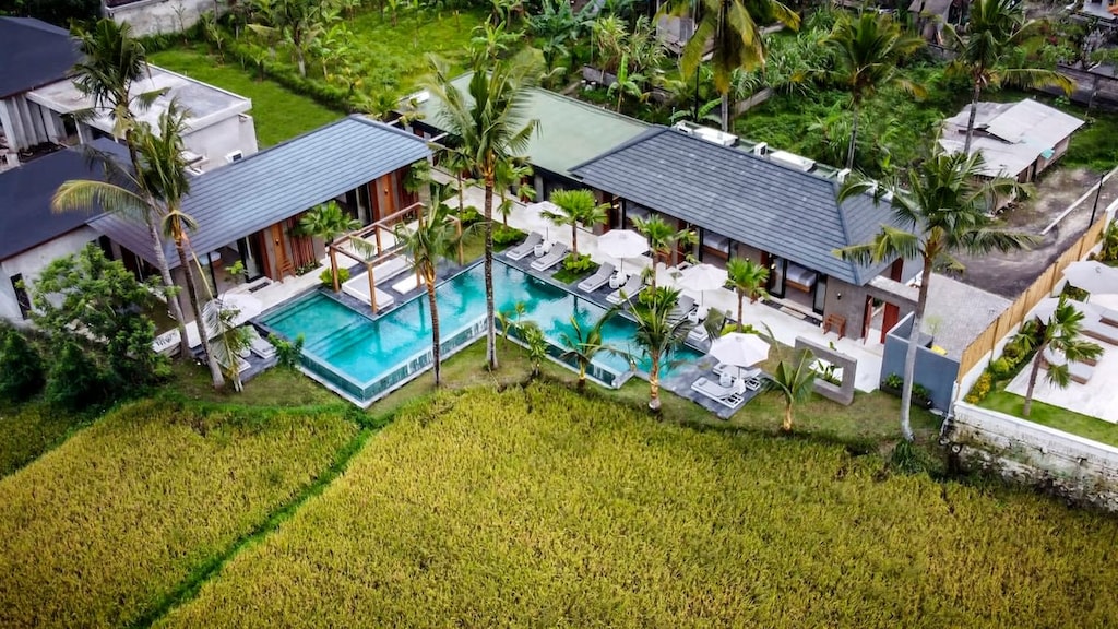 Welcome to our 5 bedroom sanctuary in Ubud, surrounded by rice fields and palm trees, just minutes from the bustling Ubud center.