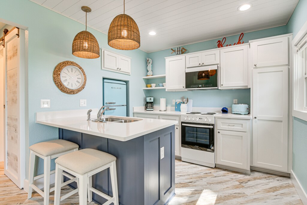 KITCHEN: Fridge, stove, oven, microwave, cooking basics, drip coffee maker (filters & coffee provided), toaster, island seating, dishware/flatware, paper towels/trash bags