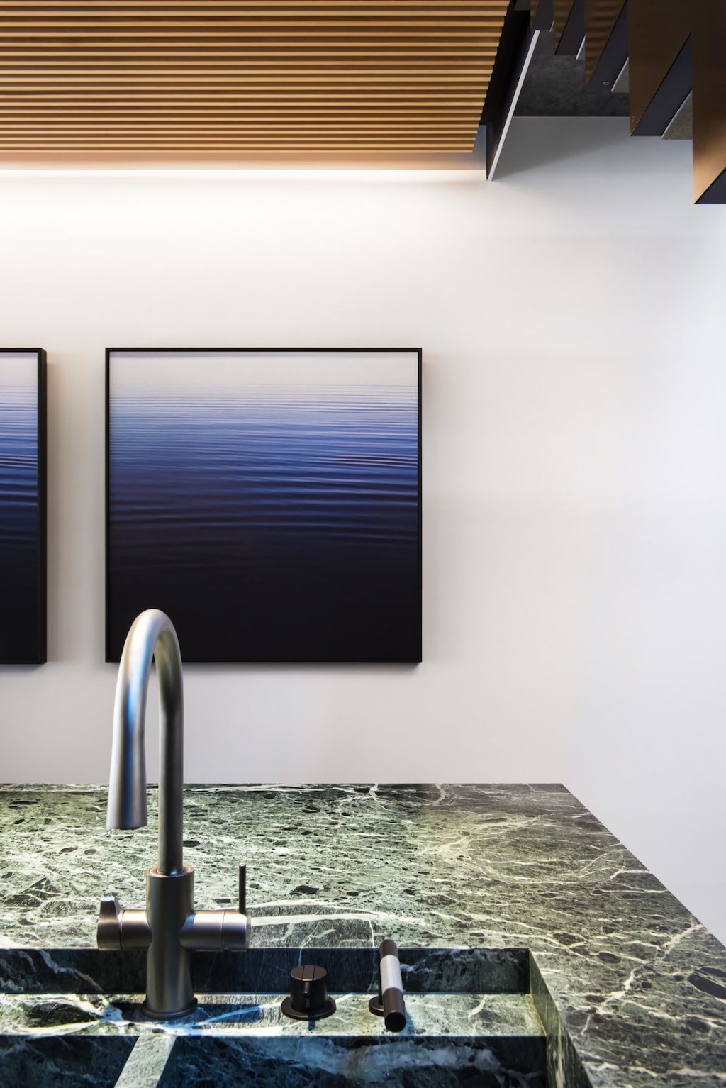 The kitchen is like a work of fine art unto itself, with a stove and island bar made of green marble. The home is equipped with security, electronic media, and smart home features, including Apple TV and Alexa voice control, and features air conditioning and underfloor heating. Gallery-worthy artwork is displayed in every room.