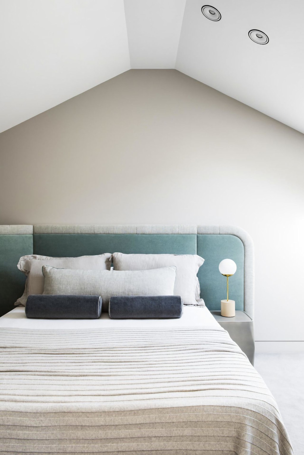 All guest suites feature designer headboards, upholstered walls, appointed robes, and ensuite bathrooms. A floating staircase leads to the upper-level bedrooms.