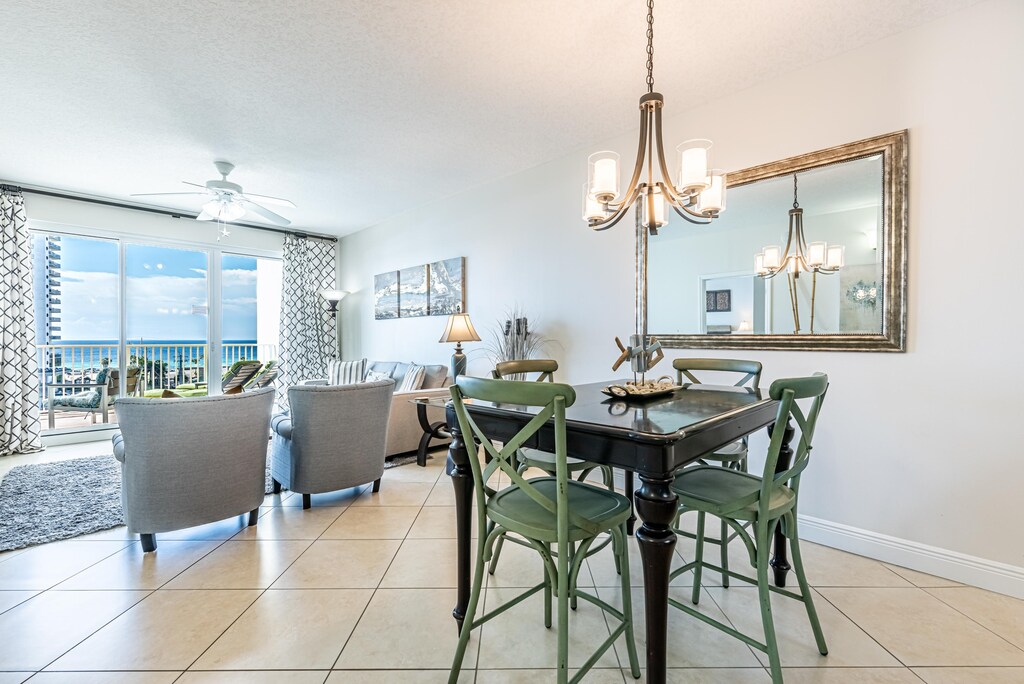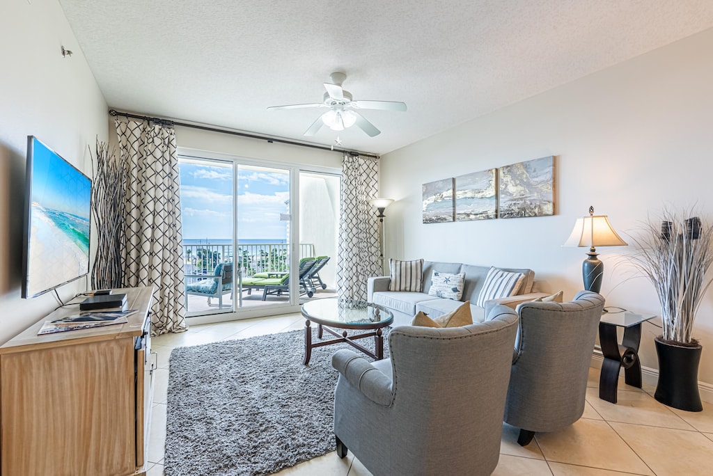 The vacation home is adorned with muted neutrals, accented by shades of blue and teal that are inspired by the unparalleled beauty of the Emerald Coast. An open floor concept connects the kitchen, dining, and living areas, which lead directly onto the balcony. Spacious seating in the living room invites you to enjoy a movie with your loved ones or catch up on your favorite shows. A dining room table seats four, and if you need seating for additional guests, a breakfast bar connected to the kitchen seats three more. The fully equipped kitchen, complete with stainless steel appliances, is ready to meet all of your culinary needs. Whip up a quick snack or prepare your family’s favorite meal as you gaze out over the Gulf.