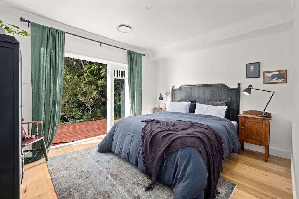The master bedroom has a king bed that overlooks a small wooden deck (perfect for your morning coffee) to old-growth cedar trees filled with the sounds of birdsong. A beautiful ensuite with a shower and toilet adds to the feeling of quiet luxury.