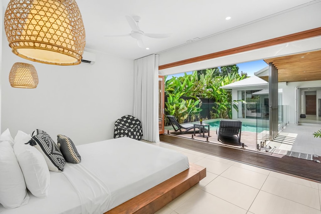 The spacious and light-filled villa affords the ultimate relaxed tropical lifestyle, with doorstep access to the vibrant esplanade precinct of Palm Cove. The property features a stunning al fresco area set around a pool, and the interiors are designed with total peace and relaxation in mind. Welcoming living spaces, tranquil bedrooms, a stunning entertainer’s kitchen and high quality bespoke finishes throughout ensure your stay will be truly memorable. Private, tranquil and utterly charming, 94 Northhouse is the ultimate place to enjoy an iconic North Queensland getaway.