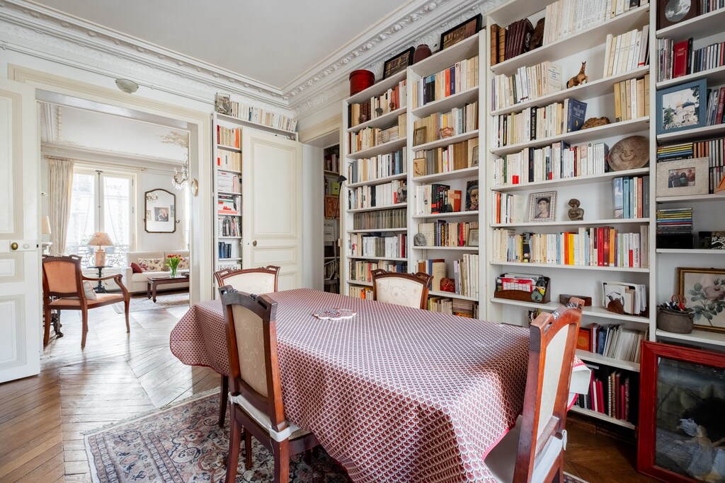 A vast home library, antique furniture and a vintage rug bring an enlightened mood to the dining room, offering space for four guests.