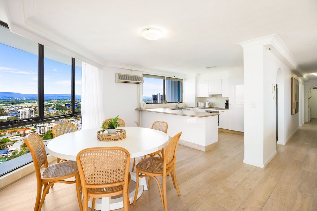 With a modern roomy kitchen with all your cooking needs servicing the dining and living areas which flow out onto a large wrap balcony overlooking Surfers Paradise Beachfront.