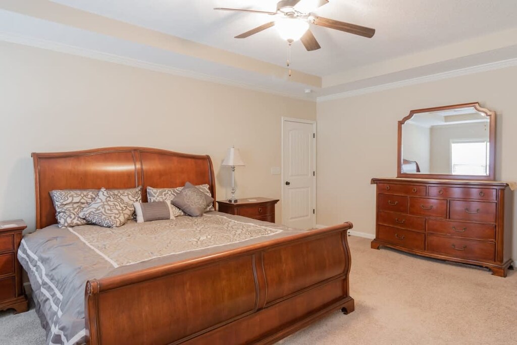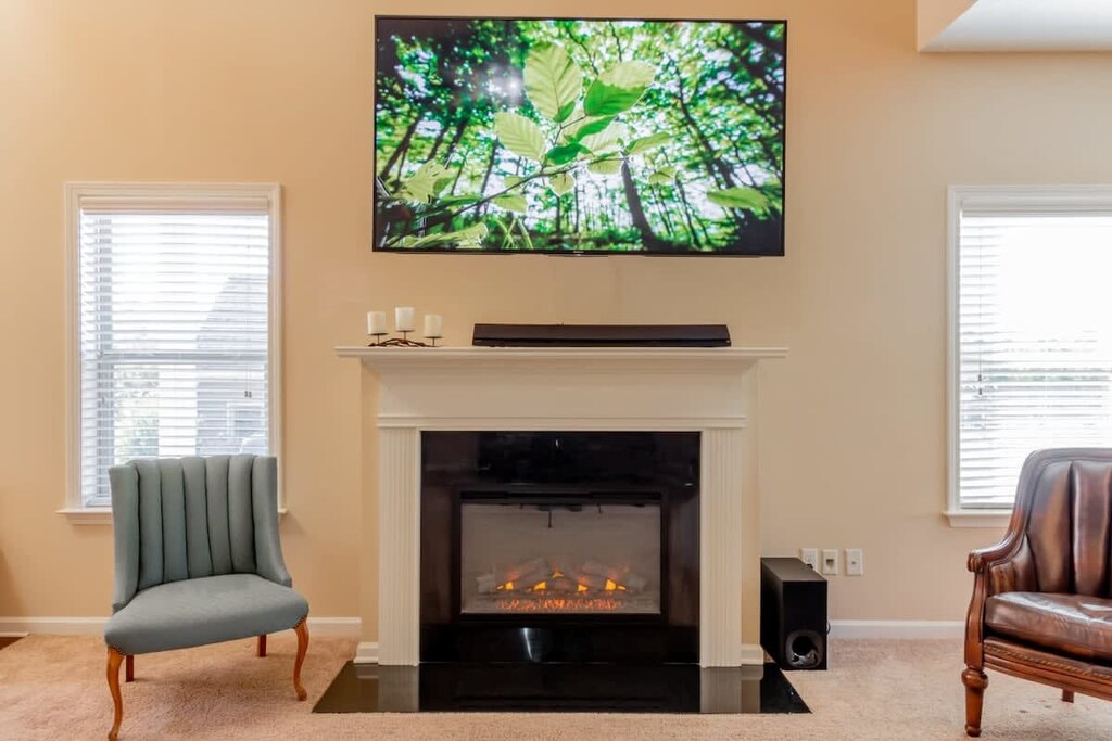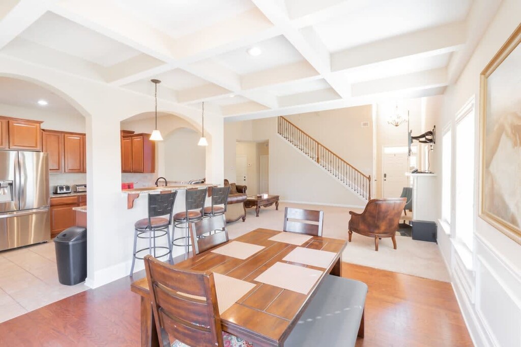 Guests will enter the home through the front covered porch. If coming at night, your path is lit with motion detection lighting. As you enter the front door, you are welcomed into a spacious open floor plan. Walking straight in you will pass the fireplace with 65 inch TV overlooking a large living room area that is able to accommodate 8 people comfortably. Just past the living room, you enter the dining area with seating for six, with a breakfast bar to accommodate an additional three. The kitchen provides all the amenities to include large LG refrigerator, built in microwave over glass top stove and a high efficiency, whisper quiet dishwasher. From the dining area, you will look out large sliding glass door into a large backyard with pines. The patio features a gas grill which is perfect to enjoy the crisp night air! When night comes, guests can take advantage of the five nicely sized bedrooms to relax and sleep. In the morning, there are three full bathrooms to allow ample space to start the day with oversized hot water heater. The master bedroom will provide extra room and privacy and includes a walk in shower. 1GB wifi will take care of all your streaming and online needs. If you’re staying for a while, the group will have two washers and two dryers to facilitate laundry. So come relax, morning or evening, on the wrap-around porch in the peaceful southern pines of Ivy Park in Fortson, Georgia. This is extremely quiet and serene. Safe and secure. If you need anything, your host is within walking distance.
