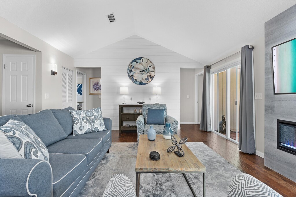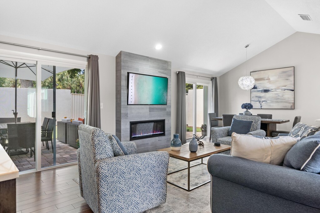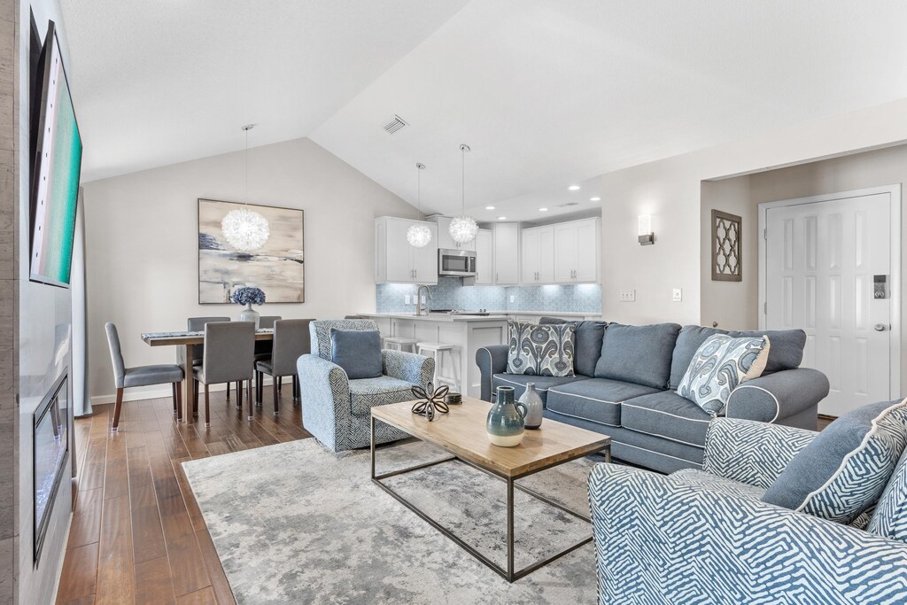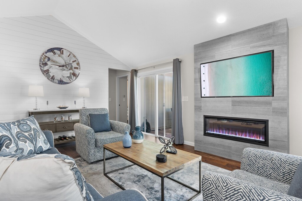 As you step through the front door, you’re greeted by an atmosphere of coastal modern elegance with an open-concept living space where natural light pours in through soaring ceilings and expansive windows. The seamless blend of the kitchen, dining, and living areas creates a spacious environment perfect for gathering with family and friends. Whether cooking dinner in the fully-equipped kitchen, sharing stories around the cozy fireplace, or simply lounging in the plush living room, every moment here is designed for relaxation.