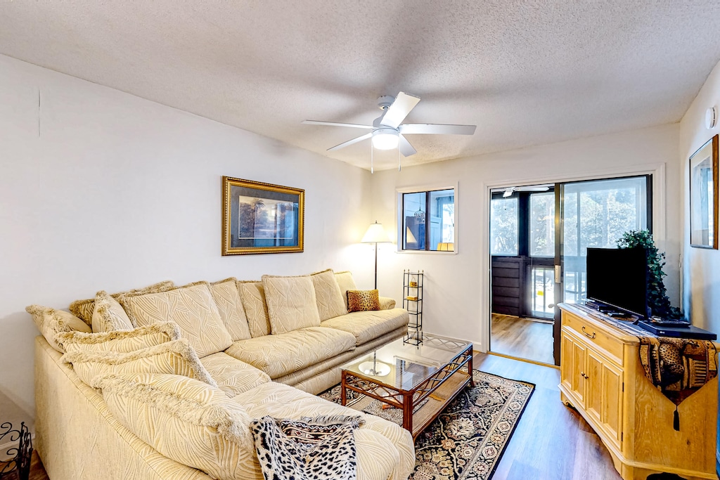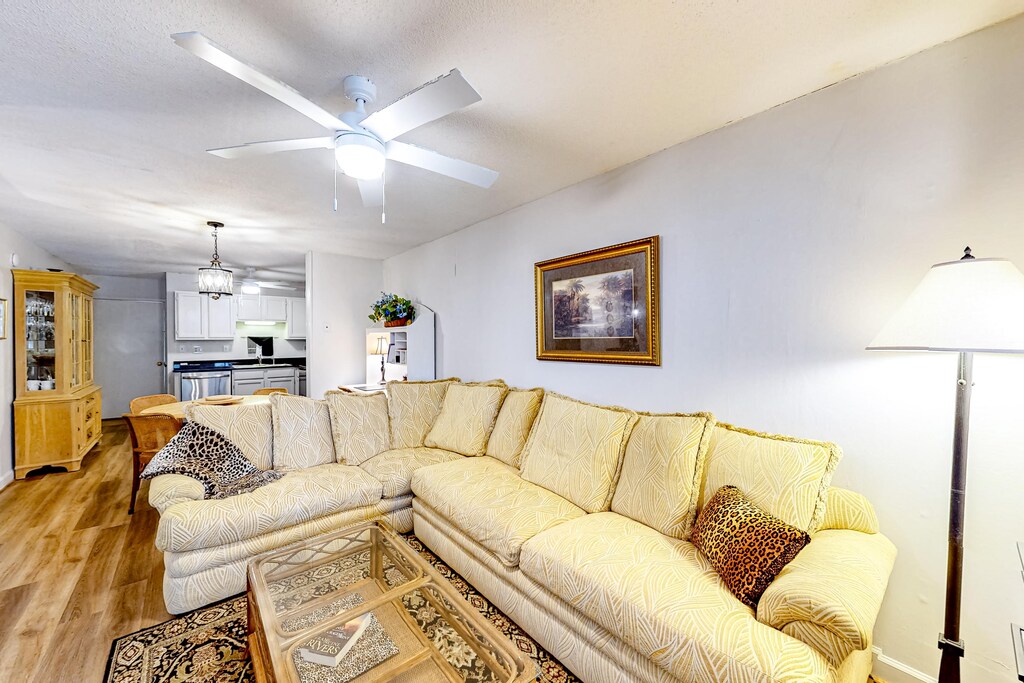 When you need a break from the sun, settle down in the open-concept interior where you can relax, dine, and cook with ease. When you aren’t dining out, the well-equipped kitchen has stainless steel appliances, ample meal prep space, and a separate coffee/drink bar. This condo is a great work-from-home option with a large desk and space to add a printer and office supplies. The private balcony overlooks the large outdoor pool, and for more recreation, you’re just steps from the indoor pool and office and exercise room.