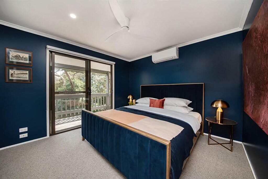 Bedroom 1: U/S: 1 x King Master Blue Bedroom + Robes + Carpet + Block out Blinds + Reverse Cycle Air Conditioning and Heating + Access to side deck (sleeps 2)