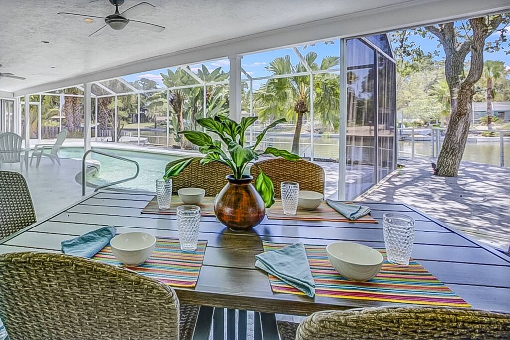 - Open the multiple sets of sliding glass doors to the covered lanai and pool deck. The luscious, mature landscaping surrounding this property, add to the feel of a tropical, one of a kind, getaway.
