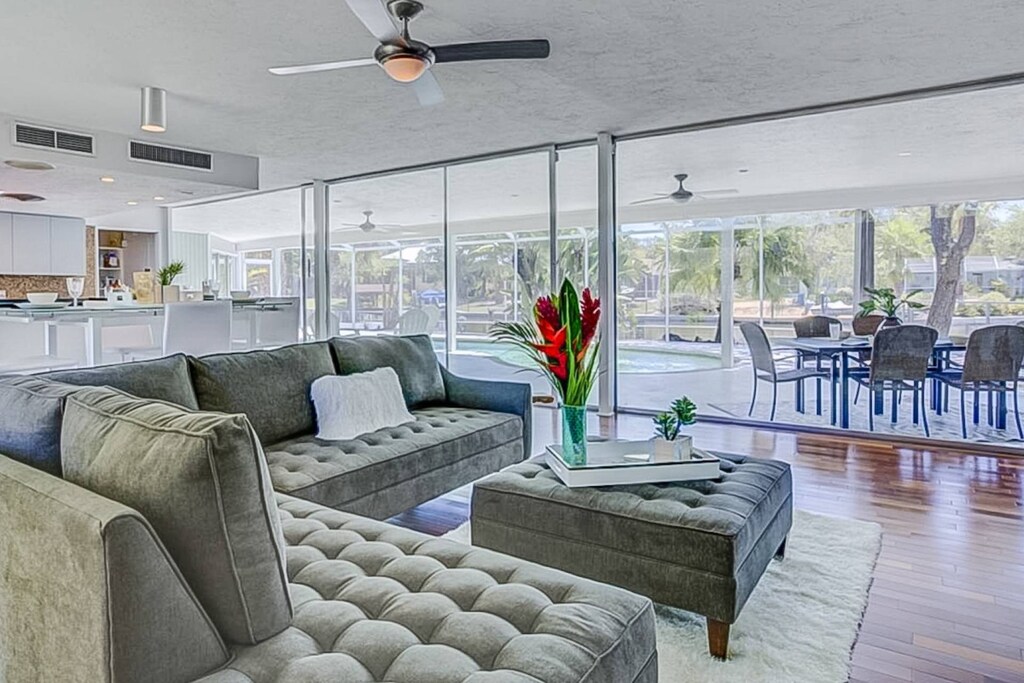 You will Never Want to Leave this 4-bedroom house on Siesta Key! Mid-Century Modern, 4 bedroom home with saltwater, heated Pool with canal views. Located within a 6 minute bike ride to Siesta Key’s Beach Access #5 and walking distance to everything that Siesta Key Village has to offer. This unique 1950’s built, partially renovated, 4 bedroom, 3 full bath, "Sarasota School of Architecture style" pool home brings a blend of both vintage and urban accents, make this home TRULY unique and one of a kind! From the stainless steel front door & glass foyer, to the Brazilian cherry wood floors throughout, walls of glass for incredible views,