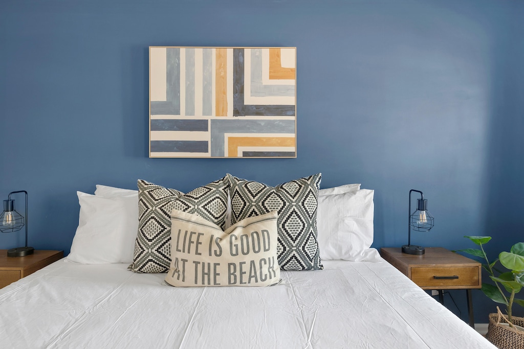 Upstairs you will find the three bedrooms and full size bathroom. Each bedroom is spacious, comfortable, and filled with natural light! The master bedroom features a luxurious King size bed, outfitted with hotel-quality linens. The bathroom can be accessed from the master bedroom and features a large vanity and a tub/shower combo. This bathroom can also be accessed from the hallway, and includes a separate vanity on this side creating privacy from the master! The additional two bedrooms feature a Queen size, and Full sized bed.