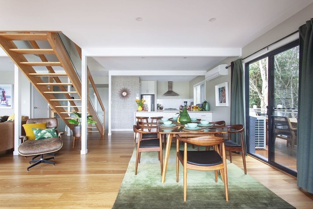 Indulge in the delightful sleeping spaces upon the home’s second level, which both feature ensuite bathrooms. Plush linens, quality furnishings and luxury retro styling promise sublime slumber. Drink in the panoramic ocean and hinterland views through wall-to-wall glass from the comfort of your king size bed. The property also includes a queen-sized bed in the studio space - a handy sleepout for guests who crave their own private space away from the main house.