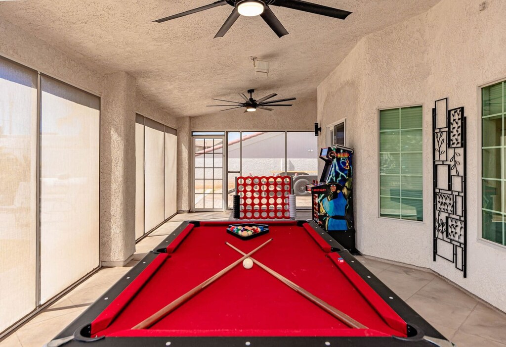 >7) Detached casita: King bedroom, full seating area with Smart TV, kitchen that’s fully equipped, full size refrigerator/stove/microwave, bar with stools (3), sliding glass doors and french doors to the pool and backyard space, ensuite bathroom