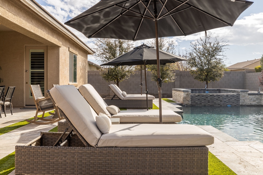 Monthly Discount automatically applied when staying 90 nights or more. Enjoy true Southwest outdoor living in this stunning Queen Creek residence, offering luxury monthly stays for families during spring training, executive relocations, or anyone looking to take a bite out of life in Arizona. The private complimentary heated pool, hot tub, and luxury lounge chairs are just perfect for relaxing and enjoying the warm Arizona sun. There is nothing to think about. Reserve and pack your bags!