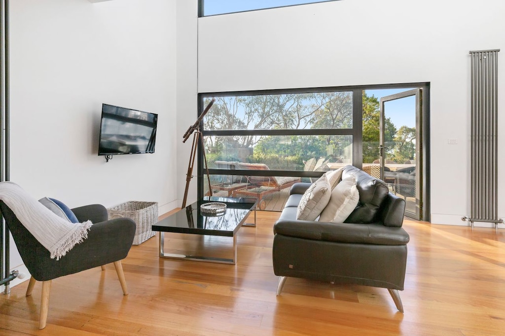 At the apex of the tri-storey residence, a large master bedroom with king bed and balcony enjoys shimmering water views and direct access via the luxe ensuite to the central deck and cedar-barrel sauna with huge porthole window gazing out across the bay.