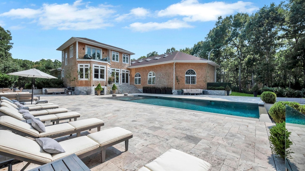 Deck/Patio (Uncovered), Lounge Chairs (8 Chairs), Patio Furniture (Table, Chairs, Umbrella), Grill (Gas), Fire Pit (Gas), Balcony, Private Pool (Outdoor, Indoor, Heated), Hot Tub (Hot Tub Attached to Pool, Freestanding Hot Tub)