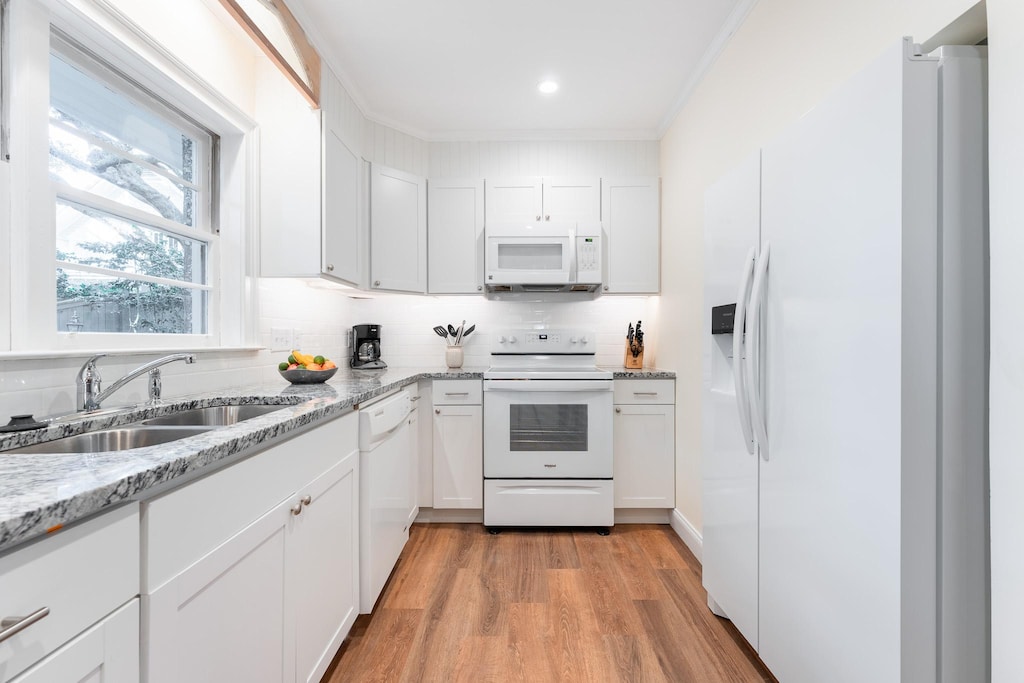 Our property is perfect for your Saint Simons trip due to its location, but also it’s southern charm inside the home. The screened in porch is perfect to enjoy a summer night overlooking the park or a breezy morning with a cup of coffee. Through the front door you will be greeted with a open concept living/dining area. The dining area seats 4 comfortably and flows into the fully equipped kitchen.