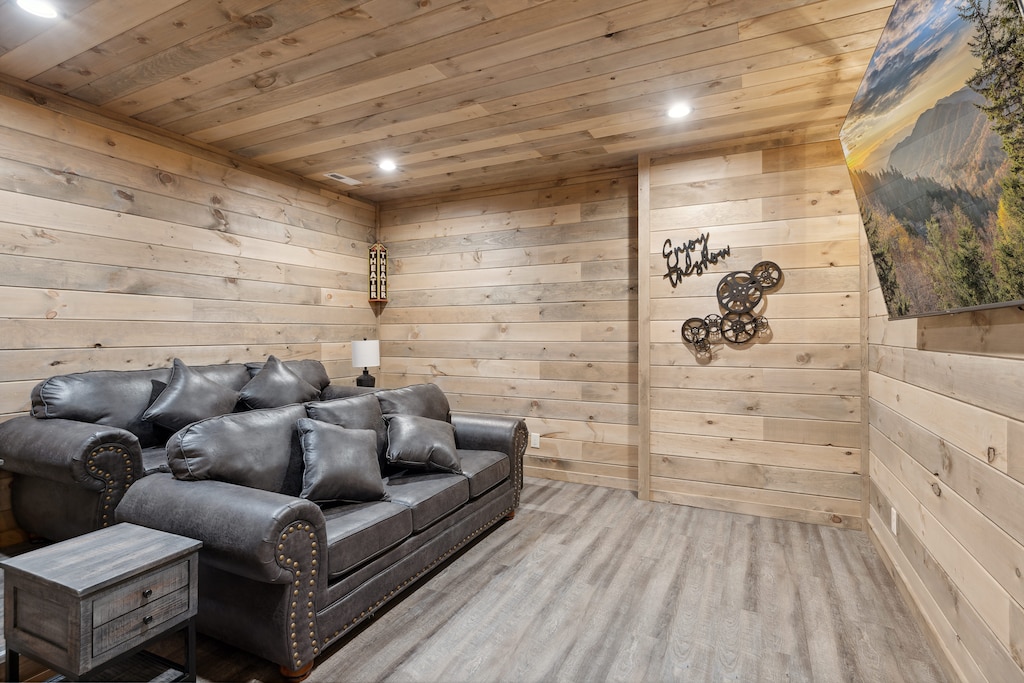 cabin features a game room and theater room, ensuring endless entertainment
