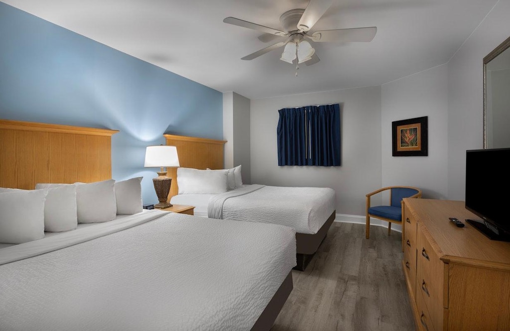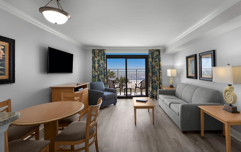 Our Oceanfront Deluxe Queen Suite contains two queen beds in a private bedroom as well as a murphy bed and sleeper sofa in the separate living room area. This room type is approximately 672 square feet and sleeps 8 people. It features breathtaking views of the Atlantic via a furnished oceanfront balcony adjacent to the living room area. Amenities to make your Oceanfront Deluxe Queen Suite feel like home away from home include: -Kitchen with Refrigerator -Dishwasher -Stove -Oven -Microwave -Coffee Maker -Cookware and Dishes -Dining Area -Washer and Dryer -2 TVs in Living Room and Bedroom -Complimentary Wireless Internet Access -Complimentary Local Calls