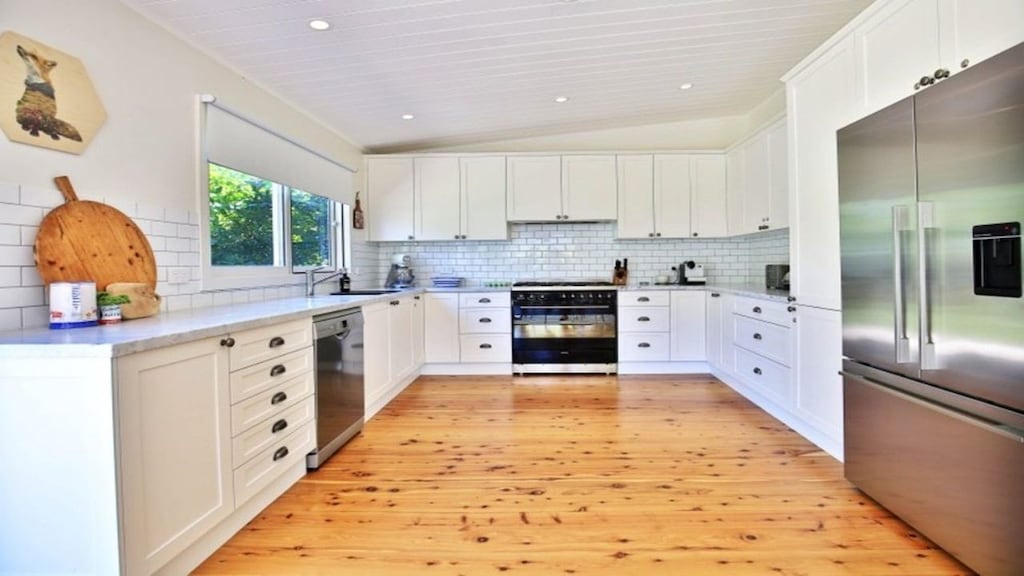 The kitchen has marble benchtops, Nespresso coffee machine, all mod cons and lots of windows and light. There is a large dining table overlooking the garden and the choice of dining in or outside with the pergola and open fireplace providing a great outdoor setting.