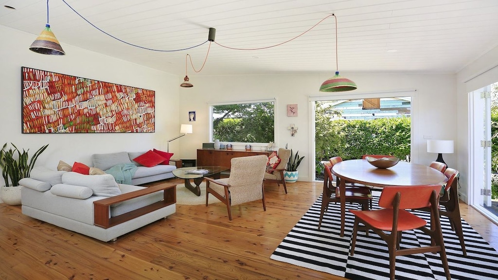 There are 3 bedrooms at the front of the house sleeping 6 guests on 1 queen bed, 1 double bed and two king singles in a twin room. The style is eclectic and cosy with an interesting mix of artwork, furniture, and decoration. Step from the living room past the renovated bathroom with a magnificent freestanding bath on Travertine floors, shower and marble vanity into a stylish new open plan kitchen dining living area overlooking the garden.