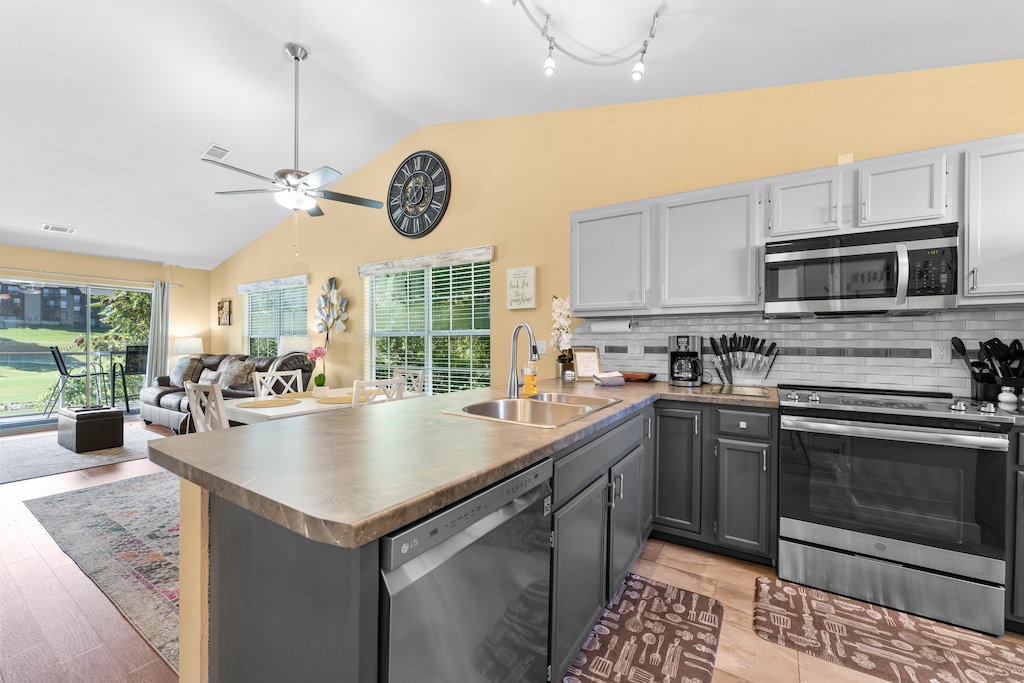 sofa and a flat-screen TV. The kitchen is fully equipped and has all the