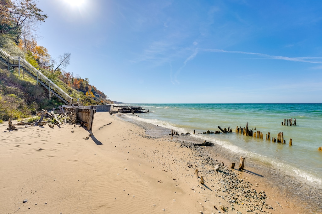 Spend your next Lake Michigan getaway staying in style at this Manistee vacation rental! With a beautiful waterfront location and 100 feet of private beach, this 3-bedroom, 2-bath cottage makes the ultimate lakeside retreat. When you’re not relaxing by the water, check out the Nordhouse Dunes or head downtown for great local dining options. Then, return home to unwind by the fire pit or take in the views from the furnished deck.