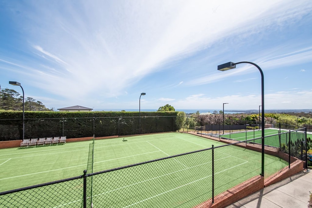 The property accommodates a maximum of 8 adults and 4 children. There are 5 bedrooms (master with King bed and views on the upper level, alcove with desk, dressing table, ensuite with shower/vanity/toilet and walk in robes), all dressed with gorgeous luxury linen. Downstairs are further bedrooms including a King Bed with robes with entrance to pool deck alongside another room which contains a King Bed, 2 King Singles (which can be joined to make a King) with robes and a writing desk and further bedroom with 2 bunk beds with robes and writing desk. These last 2 bedrooms are designed to signify a boys and girls dorm. There is a bathroom (bath/basin) and a separate shower room and toilet on this level. Between the dorms and the king bedroom there is a great entertainment room for children which houses a Wii/PlayStation 3, 40 inch LCD Plasma TV and lead directly onto the lower deck, pool and tennis court. There are 2 separate Foxtel connections on both levels. Perfect for families!