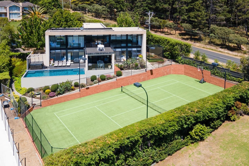 This luxury holiday house not only overlooks one of the best views on the bay across Mt Martha through the floor to ceiling windows but also a Flood Lit Championship Mod Grass Tennis Court, a deluxe in-ground deluxe 10-metre solar heated salt water swimming pool and jacuzzi, seating up to 10 people on the lower entertainment deck and 3 spacious living rooms. Enjoy the ultimate in entertainment in the rear upper living room, designed as Home Theatre with surround sound. There is a LED 55 inch Plasma TV, Blue Ray DVD/CD player, Foxtel, designer chaise lounge, library, games and games table.