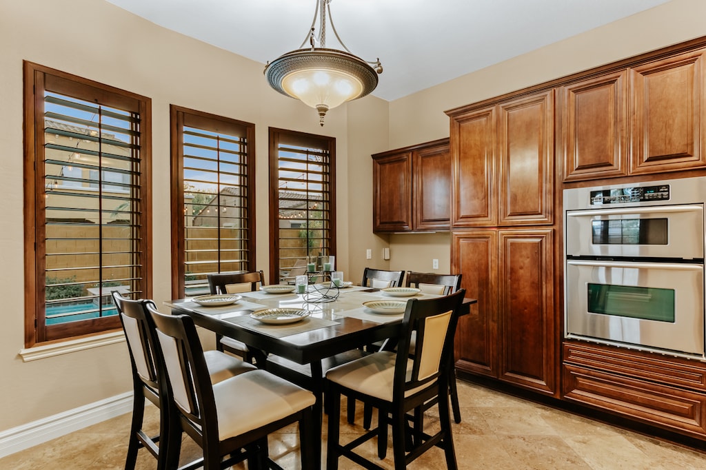 to the charming patio, providing a view of the glistening pool.