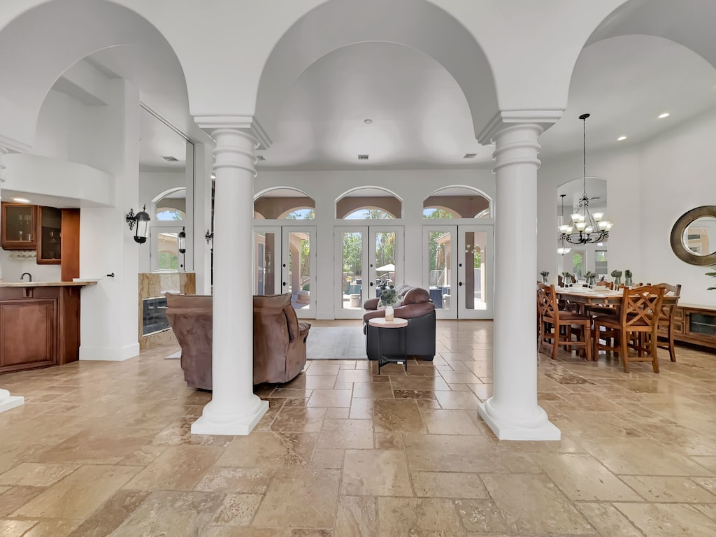 In the center of the home is a private living room and fireplace as well as a bar, perfect to whip up evening cocktails.