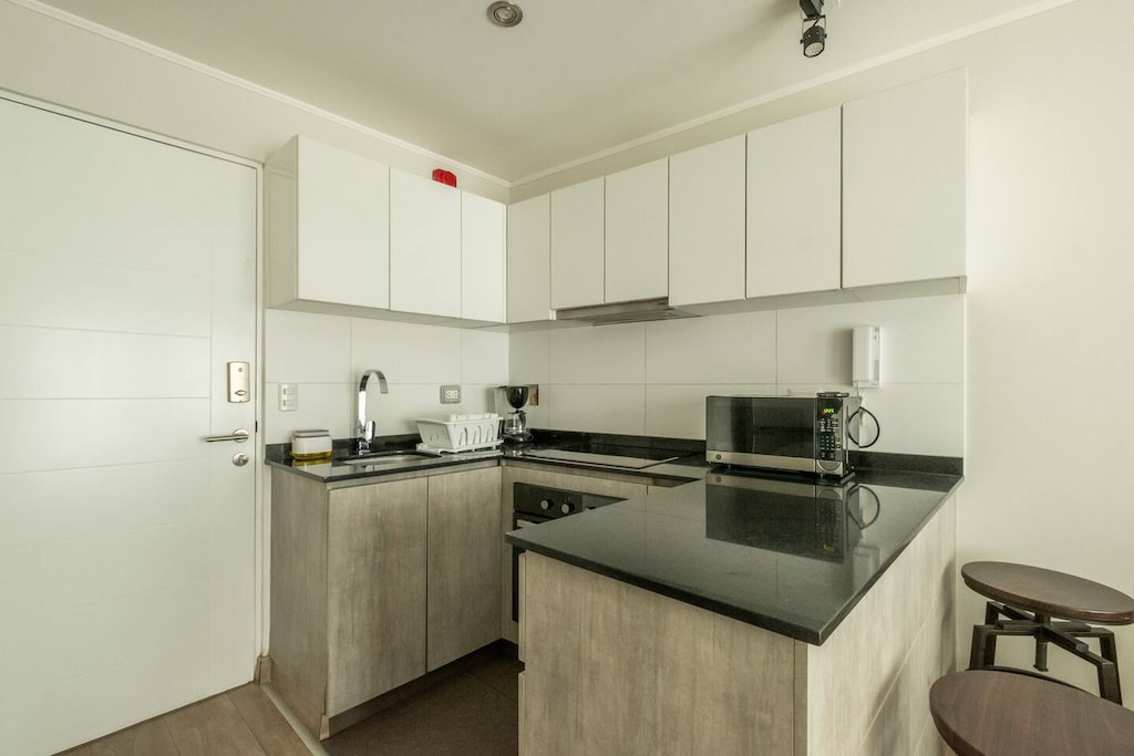 This unique place has a style all its own. Excellent location between two of the top district of turism, Barranco y Miraflores. It has a bedroom with queen bed, living room with Kitchen 100% equipped, TV , WIFI, AC, common áreas like Gym, pool, co-working, laundry. 24 hour security and parking.