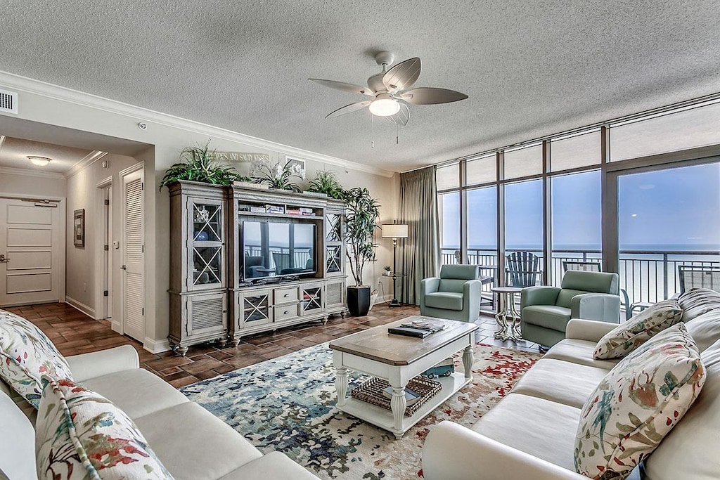 Welcome to the stunning 1801 Charleston—an oceanfront five-bedroom, four and a half-bath condo in the Indigo Tower. This luxurious retreat features a spacious fully equipped kitchen and a washer and dryer for your convenience. Indulge in the glass-enclosed showers and jacuzzi tub in the master bathroom, and take in the breathtaking views from the large private balcony.With a bedding arrangement of 3 kings, 3 queens, and a sleeper sofa, this condo comfortably sleeps up to 16 guests. The living room is adorned with elegant tile flooring complemented by a rug, creating a stylish and inviting space. As a non-smoking condo, 1801 Charleston ensures a clean and refreshing environment.
