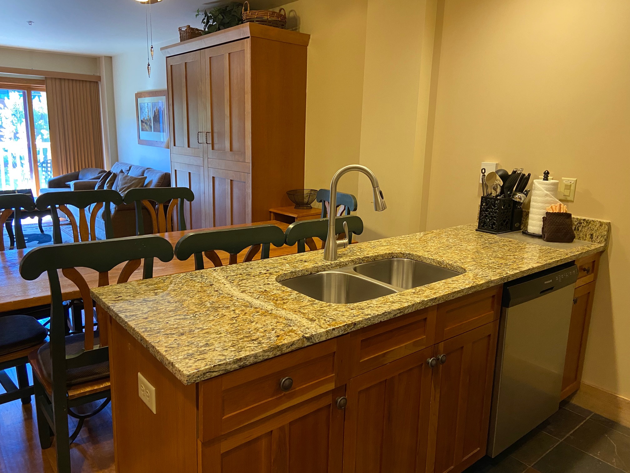 This slopeside, 2 bedroom and 3 full bathroom condo sleeps 6 very comfortably and can sleep up to 8 people. The comfortable living room is perfect for relaxing in front of the gas fireplace or watching a movie on the flat screen TV. There is a queen size Murphy bed that easily folds down from the wall between the cozy living room and the dining room table, which seats up to 8 people for when you utilize the fully stocked kitchen. The balcony has a perfectly breathtaking view of the slopes and the Gondola. The unit is so close that you can ski down for lunch! There is a third full bathroom which features a pedestal sink and shower/tub combination to accommodate any extra guests.