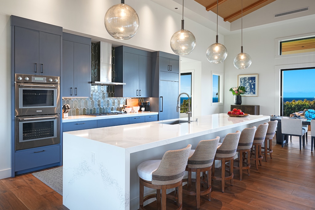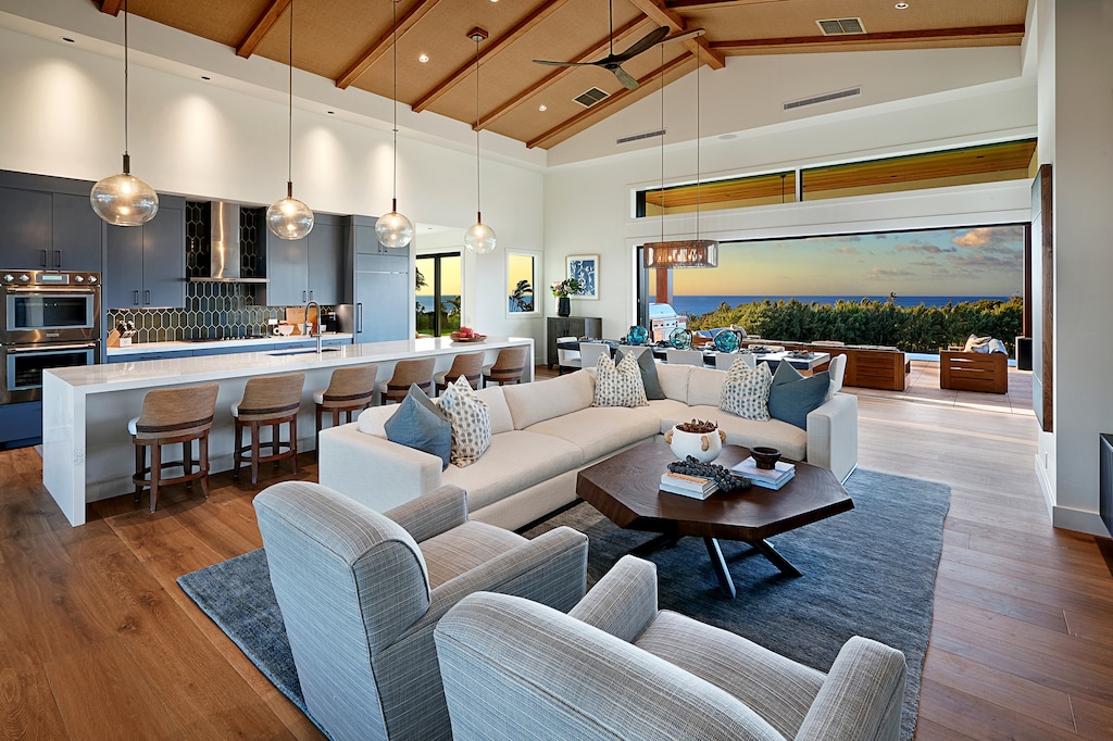 The great room features vaulted ceilings, natural light, and a full wall of sliding glass doors that open to the lanai. Plush seating and a ten-person dining area make gathering easy and comfortable. Coastal tones and thoughtful textures bring a sense of calm throughout the space.