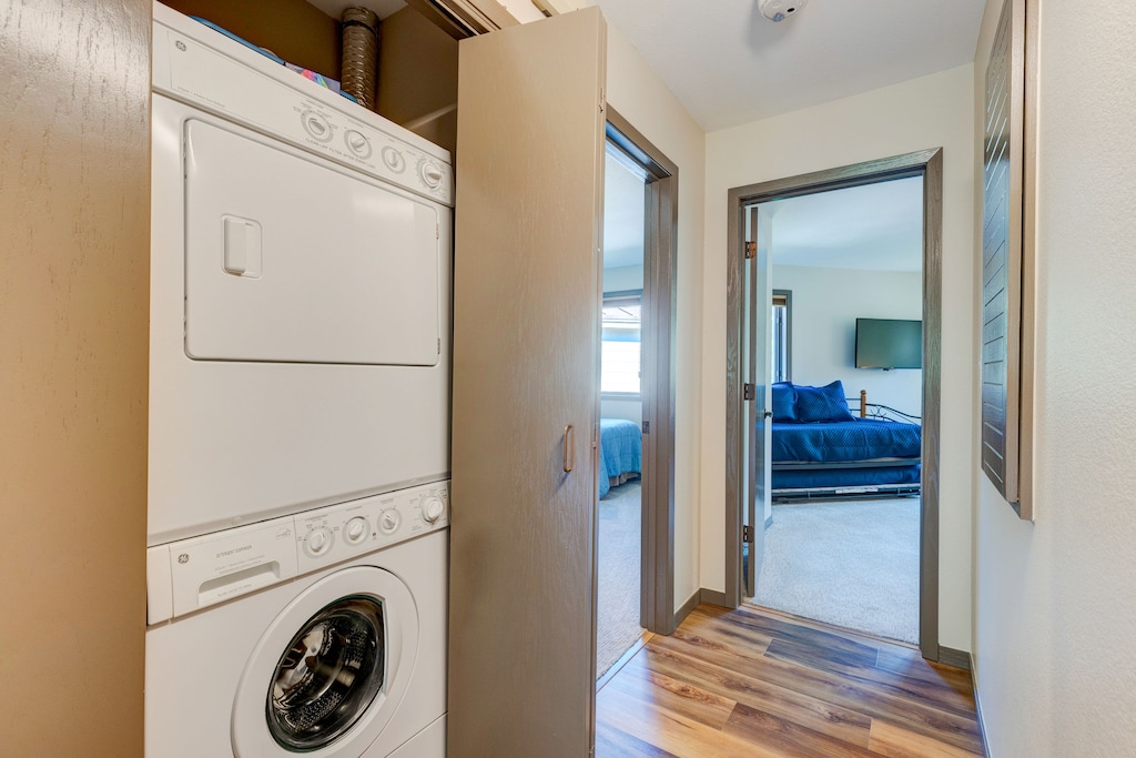This spacious 2 bedroom condo at Frostfire is walking distance to the lifts and has great amenities! As soon as you walk inside, you will immediately want to kick your shoes off, sit down on the couch and enjoy the warmth coming from the gas fireplace. This two bedroom condo features comfortable furnishings throughout, including a sofa sleeper in the living room. Along with ample seating options, you and your family can easily enjoy some down-time together after a long day of adventuring in Keystone. Just off of the living room, there is a dining table which seats six people with four additional seats at the breakfast bar. Walk out onto the balcony from the dining area and enjoy beautiful views of the Keystone slopes and Peru chairlift. The kitchen is fully stocked with everything you will need to cook meals while you are staying in Keystone. There is a private stacked washer and dryer for your convenience.