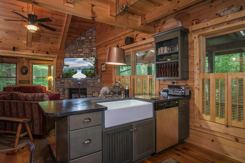 The main entrance of Black Bear Lodge opens into the kitchen and living areas. The kitchen is complete with a farm sink, stainless steel appliances, and all the dishes and cookware needed during your stay. The living area offers a gas log fireplace with stone chimney, a large SmartTV, and multiple seating options. An additional seating area off the living room is perfect for board games or reading during your stay!