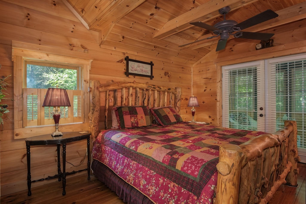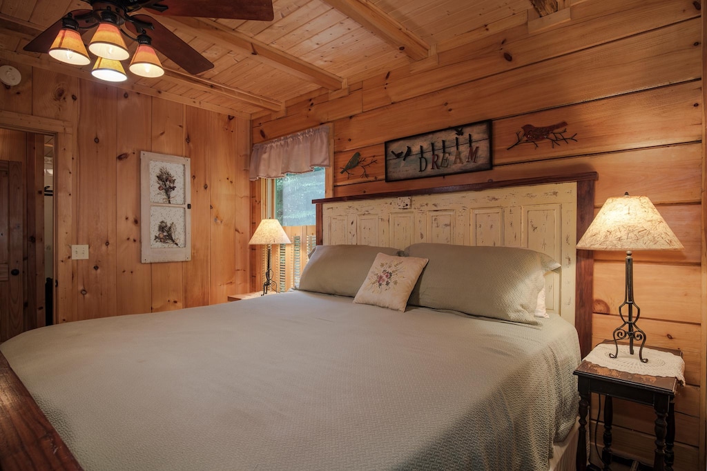 One bedroom and one bathroom are located on the main floor of Black Bear Lodge. The downstairs bedroom is home to a king-sized bed and an ensuite bathroom with dual sinks and walk-in shower.