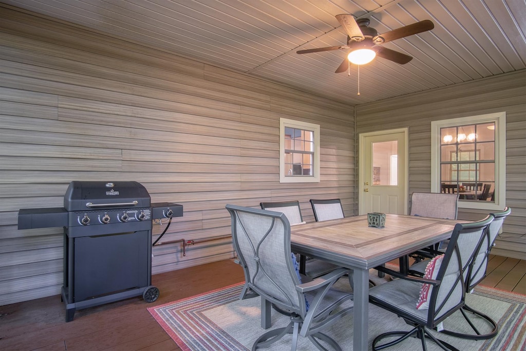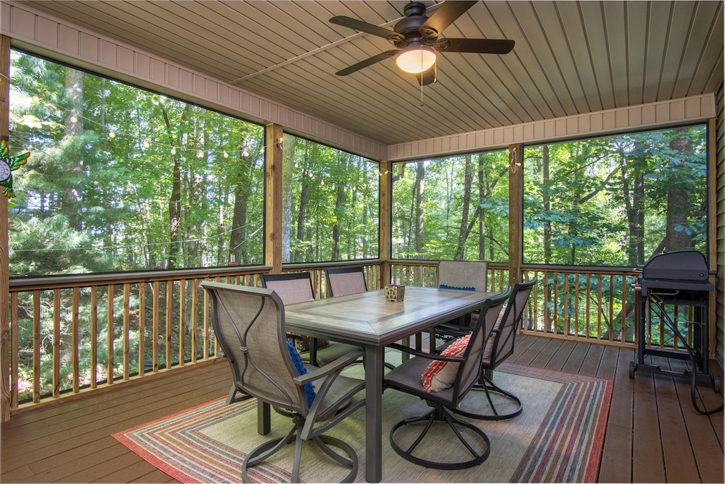 Two tables in the dining area provide seating for 10. The galley style kitchen is stocked with all the dishes, pots, pans, and small appliances needed to prepare meals for the group and the coffee station is complete with both a Keurig, a standard coffee maker, as well as an electric tea kettle. The main level screened in porch is located just off the dining area. Complete with an outdoor dining table for 6 and a gas grill, this porch is ideal for enjoying the nature view, especially when the hummingbirds are out! Also located on the main floor of Hummingbird Hideaway is the primary bedroom suite. Tastefully furnished, the primary bedroom is home to an adjustable king sized bed. The private ensuite bathroom has dual sinks, a walk in tile shower, and a large soaking tub.