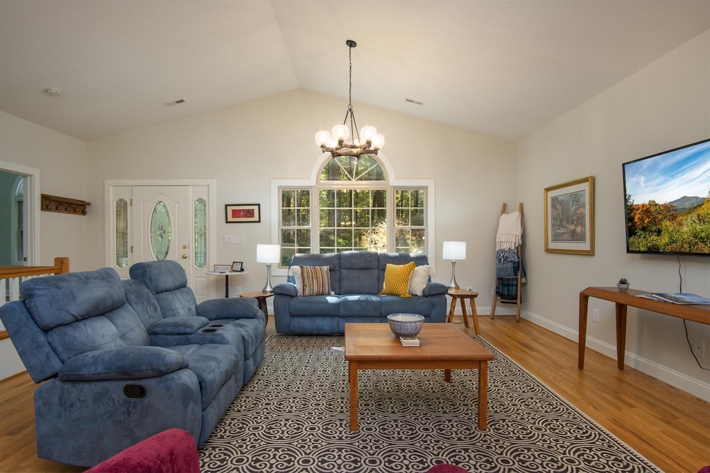 Welcome to Hummingbird Hideaway! This spacious and private 3 bedroom 2.5 bath home with a garage is conveniently located a short distance from the East Fork entrance to the amenity rich community of Connestee Falls. The easily accessed front door is the primary point of entry for the home and opens into the spacious great room with ample comfortable seating, a Smart TV so guests can log into their own streaming services, and a gas log fireplace. The half bath is located off the great room.