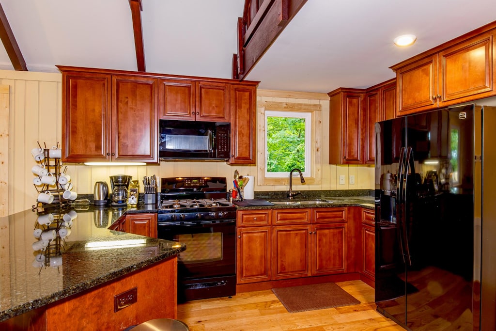 Surround yourself with the beauty of nature while you vacation at Sweet Refrain, a mountain getaway nestled in Pisgah Forest. Sweet Refrain will have you falling in love with the Smokey Mountains and have you yearn to stay longer! Many guests return to this upscale newly remodeled home, year after year. This home has several levels. Starting on the first level, it features a living room and laundry room. Upstairs on the second level you will find a spacious and naturally lighted grand room, made of the living room and updated kitchen. The kitchen has all modern appliances with plenty of counter space that will bring out the chef in any person. Additionally, on this level there are two bedrooms accented with designer-colored walls. The best feature of this whole house are large windows on this level, that peer out into the Pisgah Forest. You will find your peace and tranquility just sitting on the couch in the living room looking out those windows. You can also get the same view from the open deck just a step outside the door. The third level features the Master Bedroom loft with a beautiful view of the grand room below.