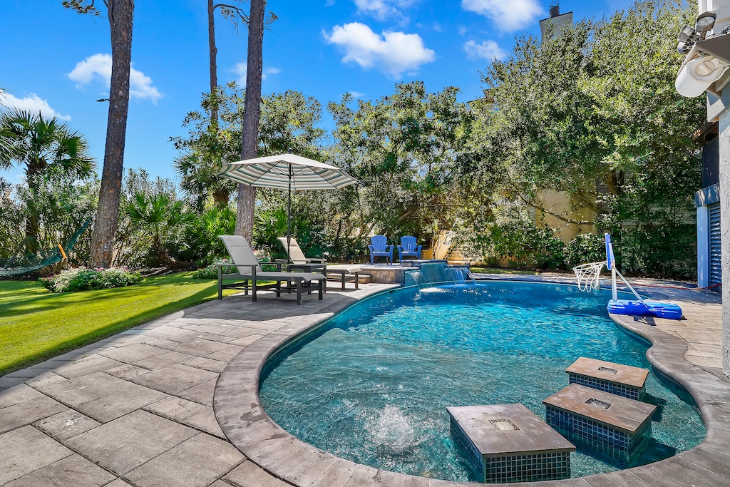 Step outside to your own beachside paradise. The expansive back porch features multiple flatscreen TVs, cozy seating for everyone, a hammock for leisurely afternoons, and a fire pit for cool nights. Just beyond, you’ll find a sparkling pool and a private path leading directly to the beach, where you can enjoy the sound of crashing waves.