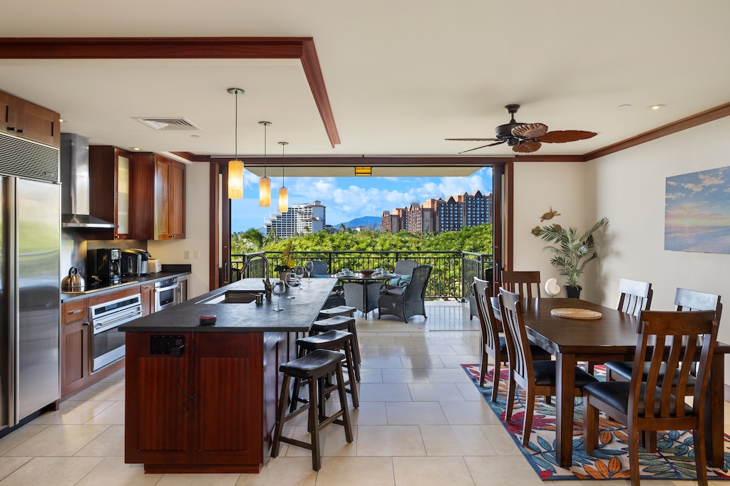 Open the floor-to-ceiling sliding doors and let the island breeze fill the bright, airy living space. Comfortable seating, warm décor, and a flat-screen TV create a relaxing environment after a day of island exploration. The dining area offers ample space for shared meals, while the adjoining lanai extends your living area outdoors for sunset cocktails or morning coffee.